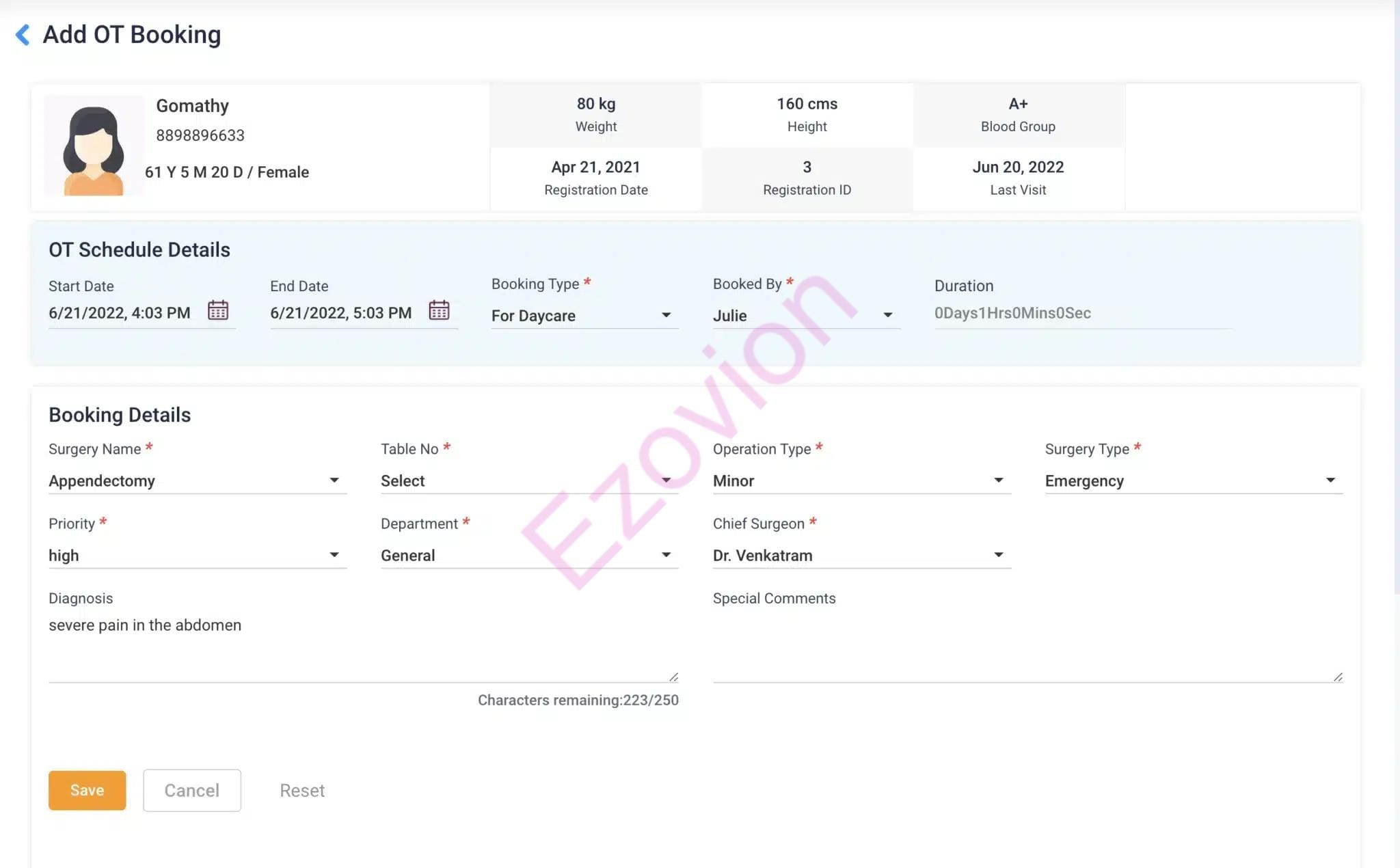 Manage more than one operation theatre with Ezovion’s Inpatient management solution and get a ready understanding of the available resources for the surgeries.