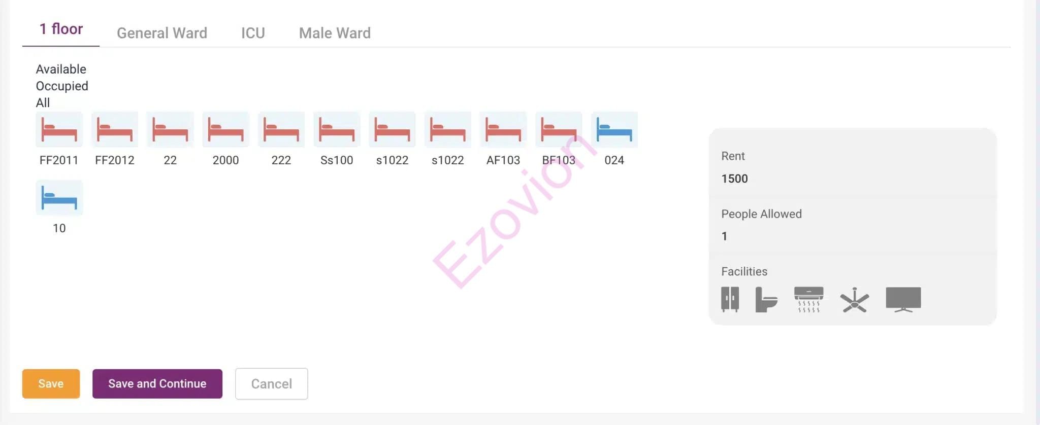 Set up Building, floor, room, beds, nursing counter, facilities, ICU, NICU, OT, Recovery room, tariff and more.