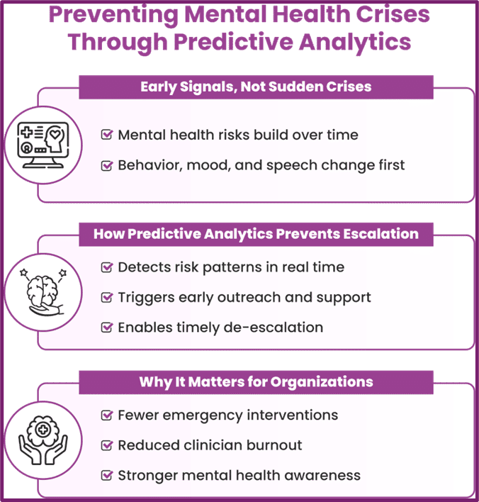 Predictive analytics mental health solutions are transforming this reality. By combining artificial intelligence, behavioural science, and healthcare predictive analytics, organisations now identify early risk signals long before humans recognise symptoms. This shift allows enterprises, hospitals, and insurers to move from crisis response to proactive mental health management.