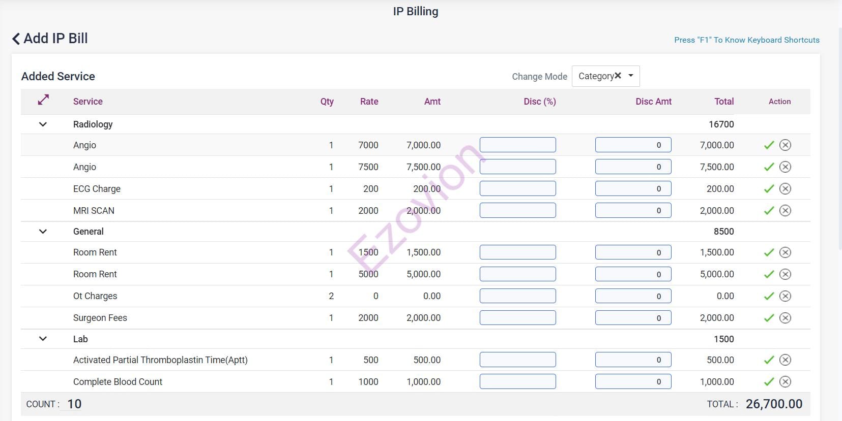 Calculate Room rents and other charges involved. Auto-Create billing during every phase of IP.
