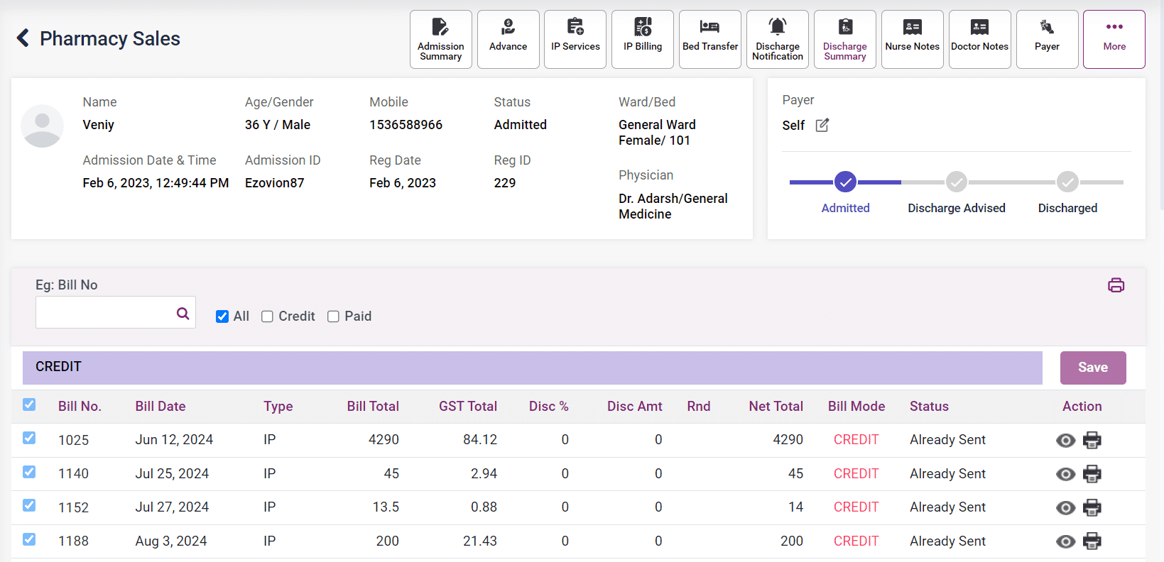 Bed transfer and room rent will be calculated based the patient movement and added into IP bill automatically.