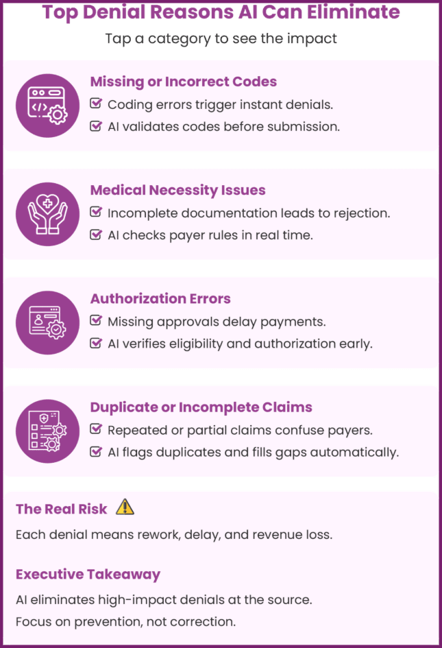 AI creates a preventive revenue strategy. Hospitals avoid future losses by addressing issues before they impact reimbursements.