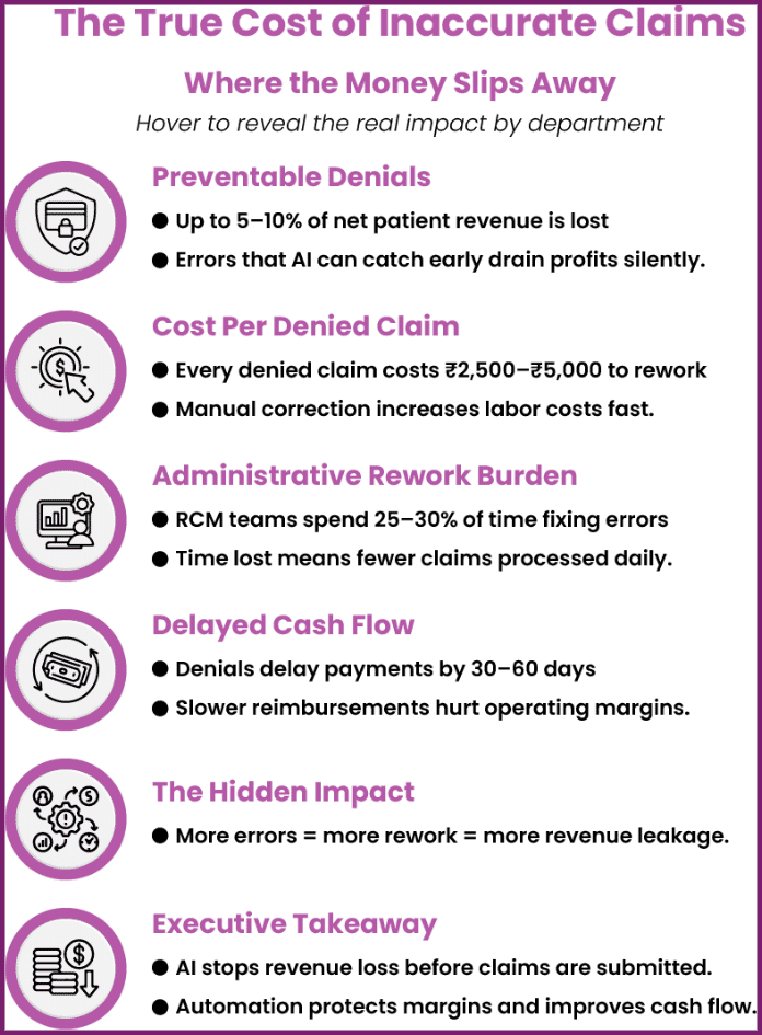 This early mitigation reduces claim denials in healthcare consistently, shortens payment turnaround times, and strengthens overall cash flow. As denials shrink, so do the hidden costs associated with review cycles and write-offs, enabling clinics and hospitals to retain more of the revenue generated from services already delivered.