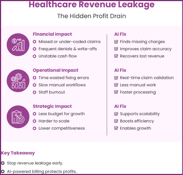 Healthcare revenue leakage directly reduces reimbursements by allowing billable services to go unclaimed, under-coded, or denied. Over time, these losses accumulate into significant write-offs that weaken financial stability. Hospitals also experience unpredictable cash flow, which makes budgeting and long-term planning difficult. Manual billing workflows often fail to identify errors before claim submission, leading to delayed payments and costly rework.