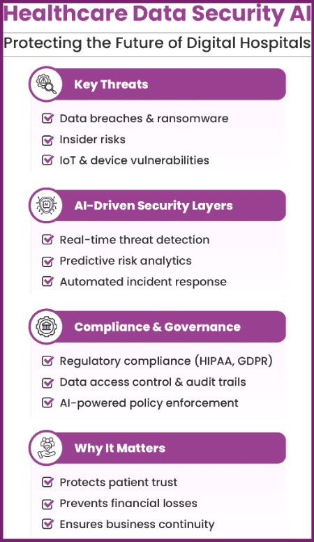 Security remains a top priority for healthcare leaders. An AI-powered hospital information system must ensure data protection without compromising usability. Hospitals deploy healthcare data security AI to detect threats, prevent breaches, and ensure compliance. This technology continuously monitors systems and identifies vulnerabilities in real time.