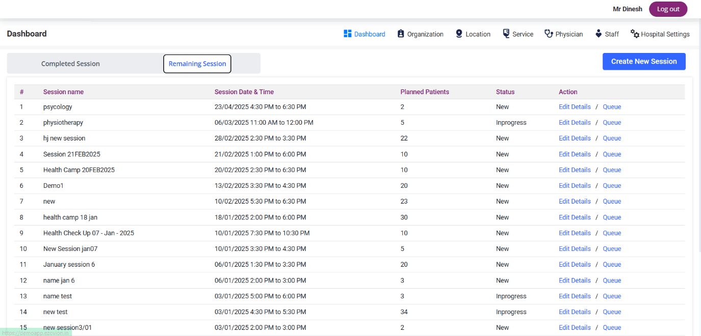 A centralised dashboard serves as your command centre for virtual healthcare delivery. The system provides organisation-based login access with complete visibility into session details, camp organisation capabilities, and essential management tools.